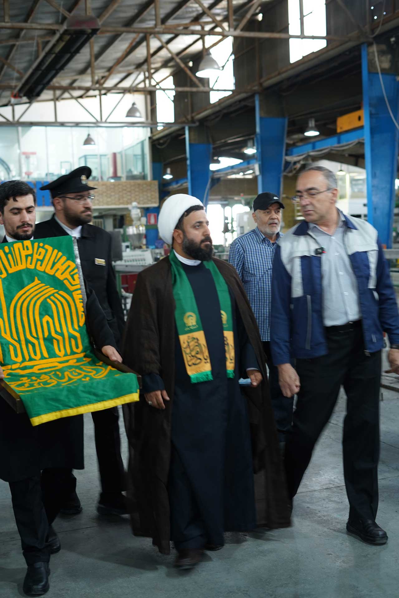 – تبرک پرچم مقدس توسط کلیه حاضرین و سپس تبرک و سینه زنی در محل سالن تولید و گذری در بین خط تولید